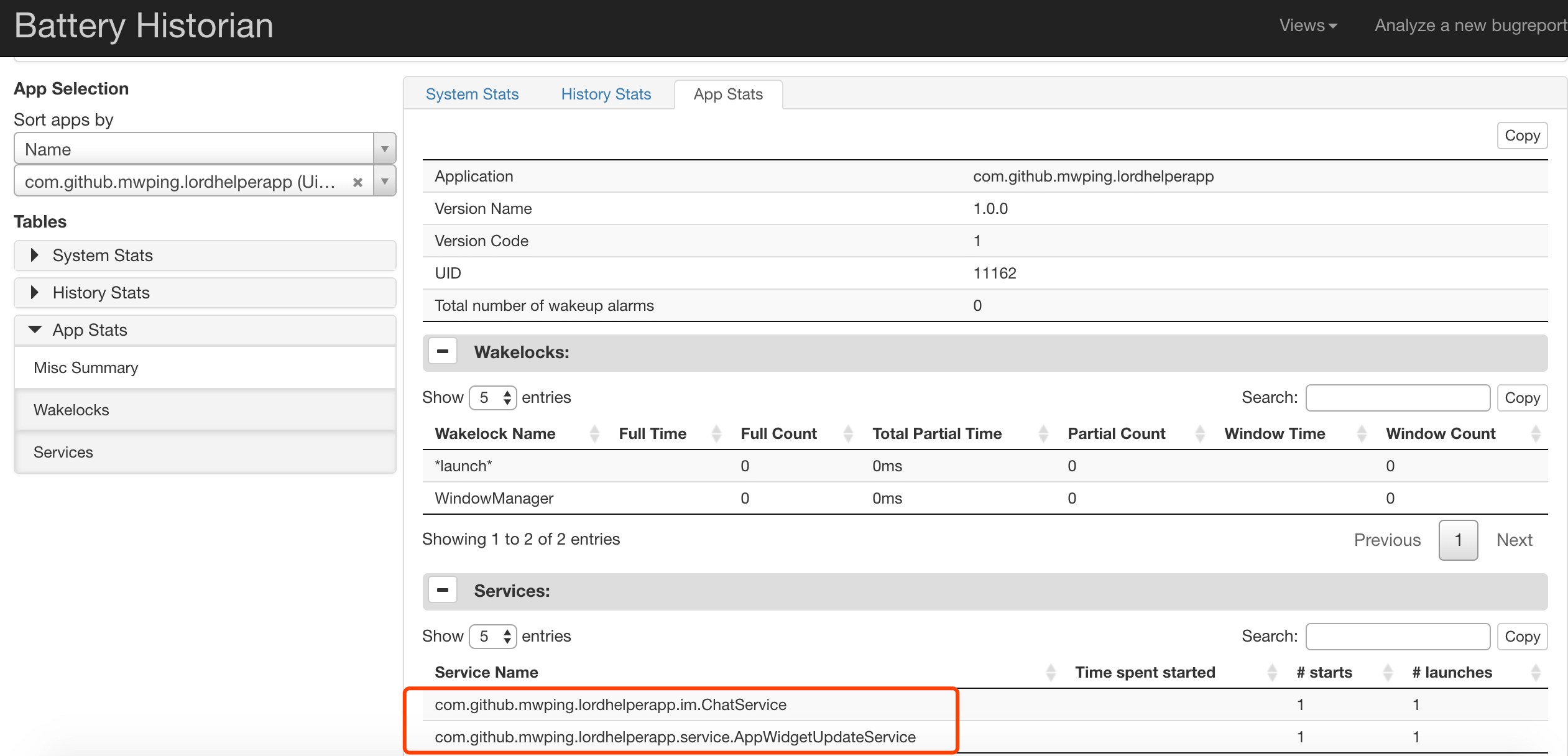 从报表中可以看到电量使用的场景,例如有几个Service在耗电: