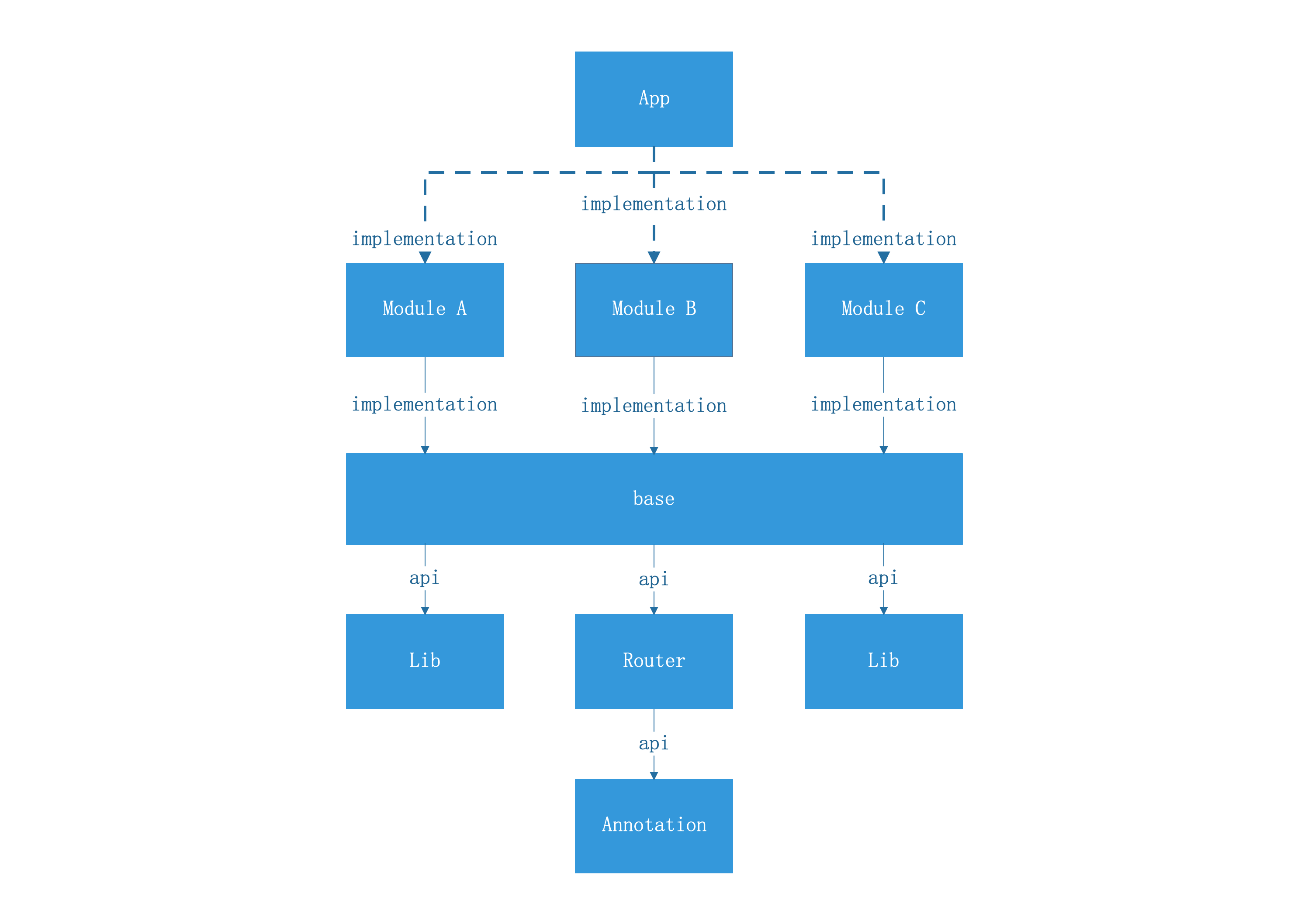 - 当assembleMode=false时,App不依赖ModuleA、B、C,这三者可以独立运行;