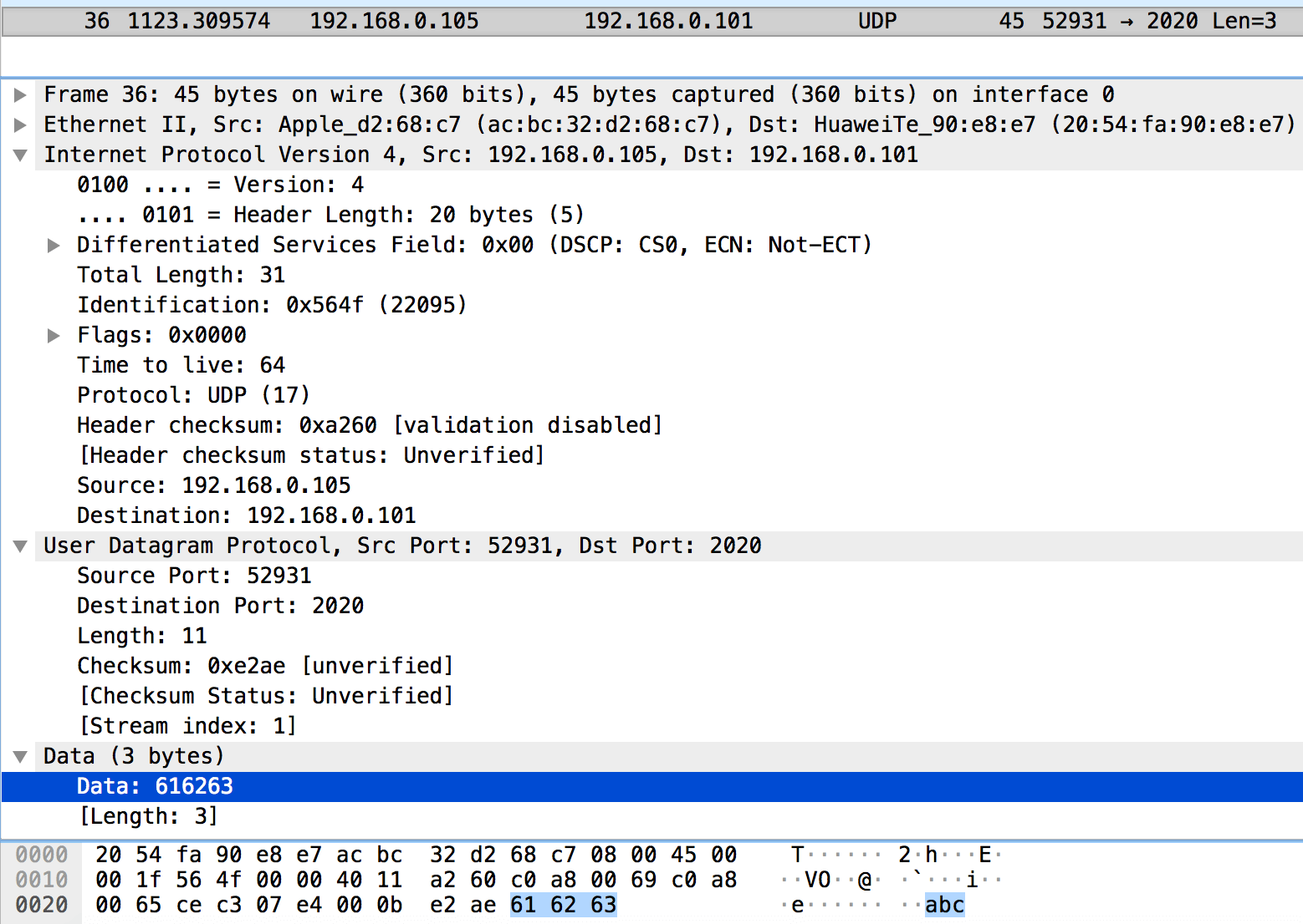 例如,使用UDP协议发送字符串”abc”,抓到的数据包如下: